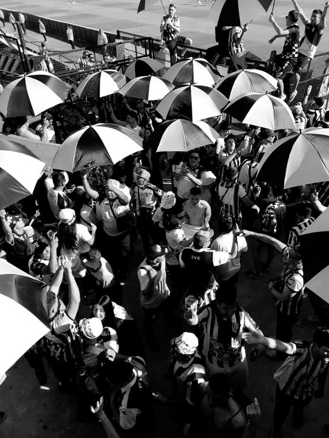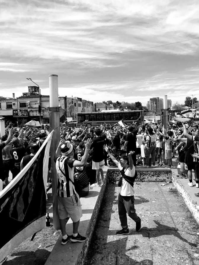 Me abrazo con todos los que encuentro, absolutamente con todos. Primero en la tribuna, luego en la cancha, luego en la calle, luego en la avenida, luego en el colectivo. Acá estamos ahora, Amadeo duerme abrazado a su camiseta blanquinegra, todavía mojada por la lluvia y el llanto. Duerme feliz, vivió algo que va a recordar por siempre, como me pasó a mí con esas primeras vueltas en calle Lencinas. Alguien se despierta en el piso de arriba del colectivo y comienza a cantar, de a poco se van sumando todos en un gesto animal que nos identifica en un mismo aullido. La ruta sigue, ya no estamos en Buenos Aires pero invoco al poeta porteño que suena en mi celular mientras comienzan a entrar los mensajes de familiares y amigos, Minimal dice: “Y que nadie me diga que no entiende lo que estoy diciendo / que nadie me diga que no ve que nos estamos yendo”.
